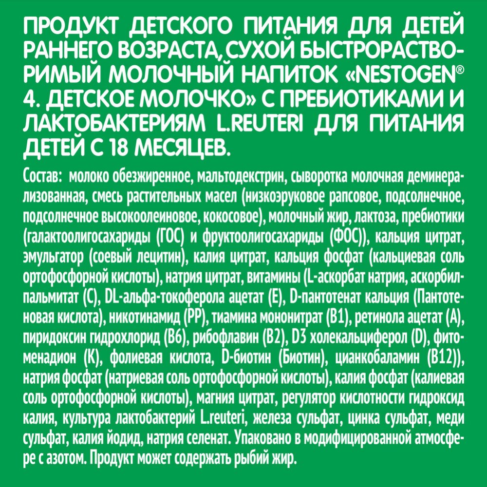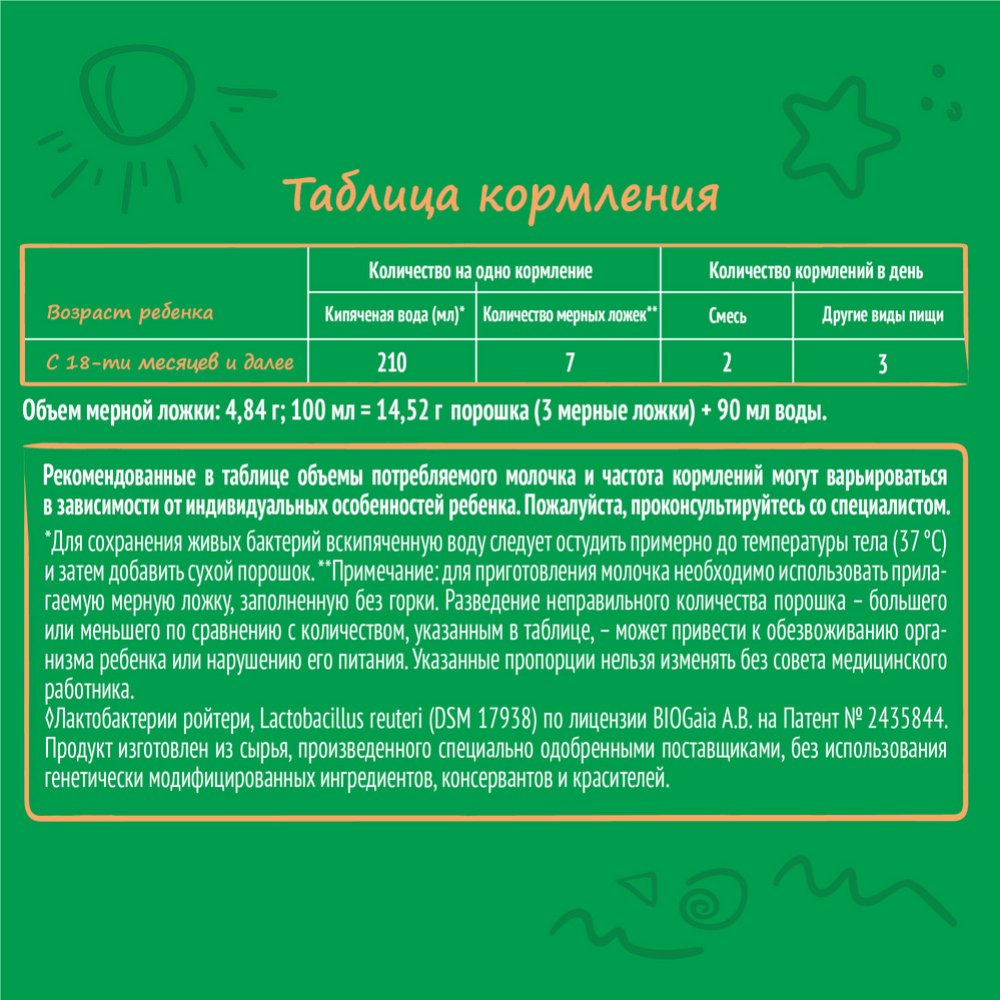 | Состав | обезжиренное молоко, мальтодекстрин,сыворотка молочная деминерализованная, смесь растительных масел (низкоэруковое рапсовое, подсолнечное, подсолнечное высокоолеиновое, кокосовое), молочный жир, лактоза, пребиотики (галактоолигосахариды (ГОС) и фруктоолигосахариды (ФОС)), цитрат кальция, эмульгатор ( соевый лецитин), цитрат калия, фосфат кальция, цитрат натрия, витамины (L-аскорбат натрия, аскорбилпальмитат (С), DL-альфа токоферола ацетат (Е), D-пантотенат кальция (B5), никотинамид (PP), тиамина мононитрат (B1), ретинола ацетат (A), пиридоксин гидрохлорид (B6), рибофлавин(B2), D3 холекальциферол (Д), фитомаменадион (К), фолиевая кислота (В9), D-биотин (B7), цианкобаламин (В12)), фосфат натрия, фосфат калия, цитрат магния, регулятор кислотности гидроксид калия,культура лактобактерий L. reuteri (не менее 8,9х10^5 КОЕ/г), сульфат железа, сульфат цинка, сульфат меди, йодид калия, селенат натрия. |