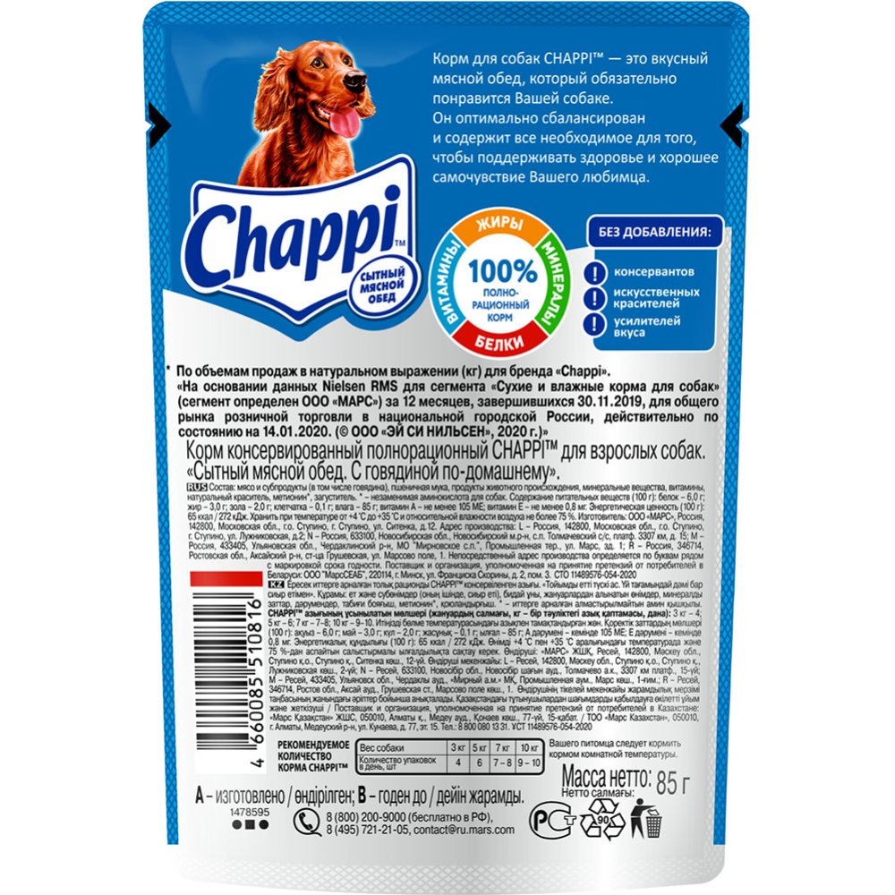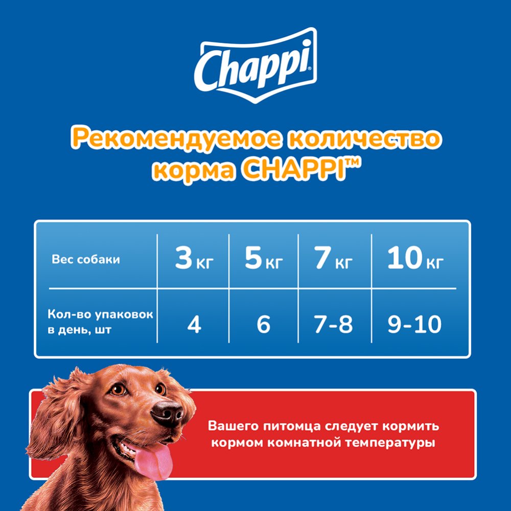 | Краткое описание | Для собак Chappi - это вкусный мясной обед, который обязательно понравится Вашей собаке. Он оптимально сбалансирован и содержит все необходимое для того, чтобы поддерживать здоровье и хорошее самочувствие Вашего любимца. |